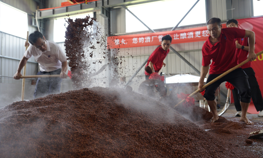 時值春釀黃金期,車間內(nèi)蒸汽氤氳,酒香撲鼻。身著工裝的老師傅們手持木鏟,將浸潤后的紅纓子糯高粱 倒入設(shè)備中蒸糧。動作行云流水,每一鏟的力度與角度都精準(zhǔn)如刻度——這是數(shù)十年經(jīng)驗(yàn)?zāi)毜?/span> “手上功夫”。